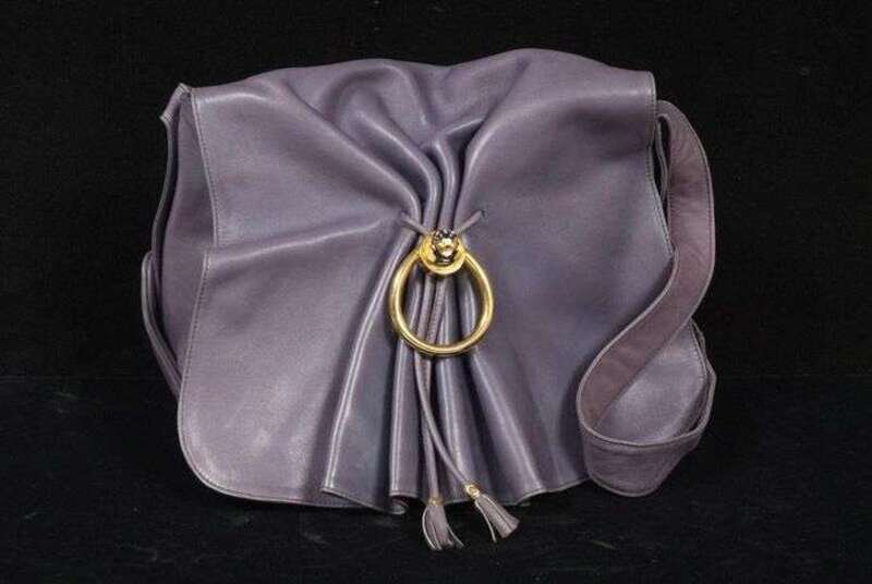 Dusty lavender supple leather shoulder bag with long strap; with a centrally gathered over-flap closure decorated with a leather cord-tie and dramatic gold loop and blue and white enameled "wild cat" detail, with other small gold details, lined in pigskin and embossed "Gucci" in gold.