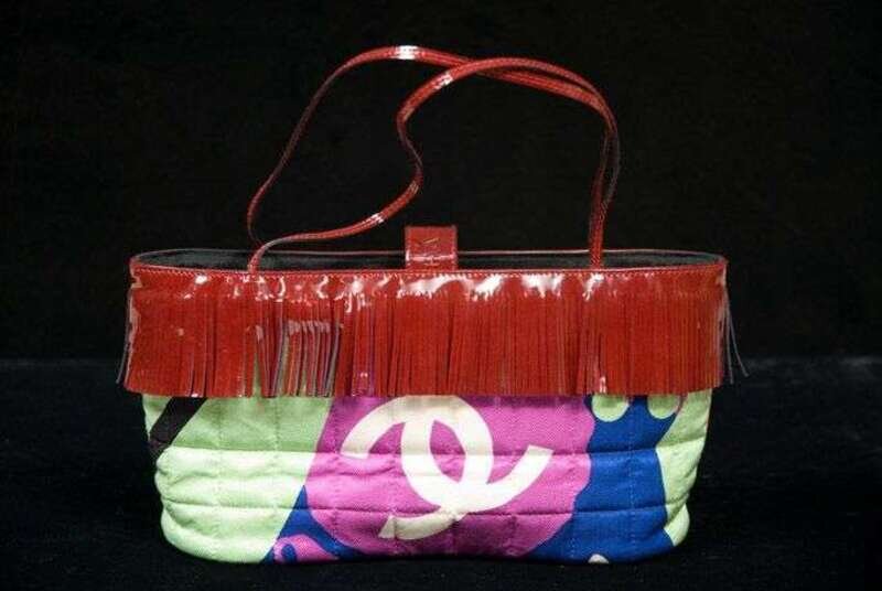 Small checkerboard quilted bag with skinny wine-colored patent leather top handles and fringe around the top, in a brightly colored logo-print silk twill.
