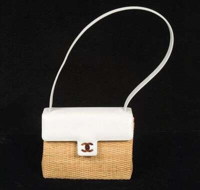 Rectangular basketweave bottom with white leather over-flap and handle, faux tortoise "CC" turn-lock logo clasp.