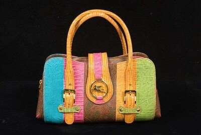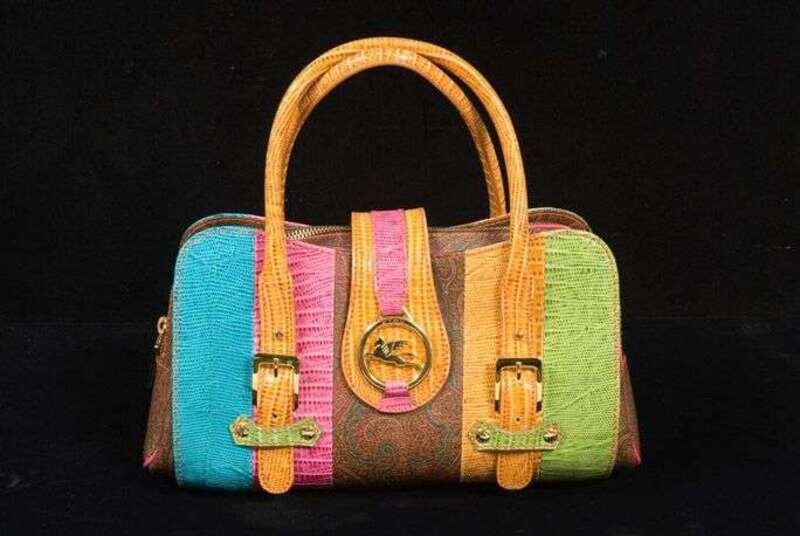 With large gold logo detail on a magnetic flap closure in addition to the zip-top, two short top handles.