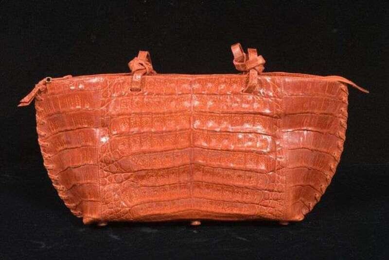 One small avocado green satchel, one beige with a clamshell opening and braided strap, and one bright orange with whipstitch details on the sides and knotted handles.