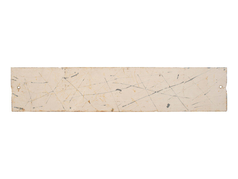 20 x 4 in. metal sign painted white with black lettering (wear consistent with age and use, bending, significant surface scratching throughout).