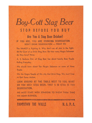 [SEGREGATION]. Boy-Cott Stag Beer. Stop Before You Buy. Are you A Stag Beer Drinker? If You Are, You are Drinking Segregation. [Memphis, TN]: N.A.P.A., n.d., [1964?].