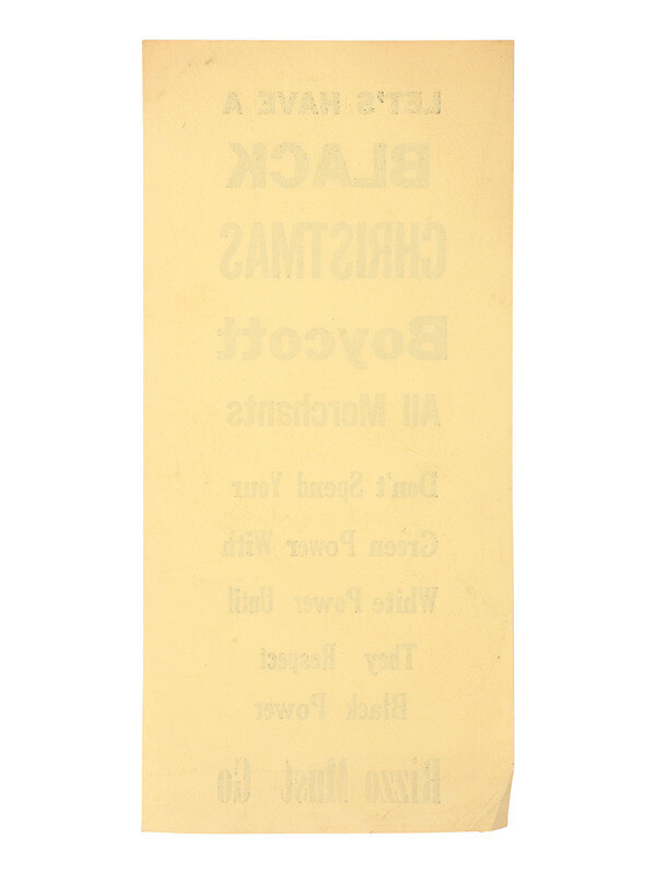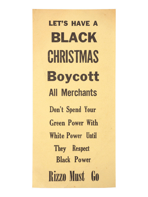 4 1/4 x 9 1/8 in. printed handbill on yellow paper (creasing, soiling, toning). Let's Have a Black Christmas. Boycott All Merchants...Rizzo Must Go. [Philadelphia, PA]: n.p., [1967].