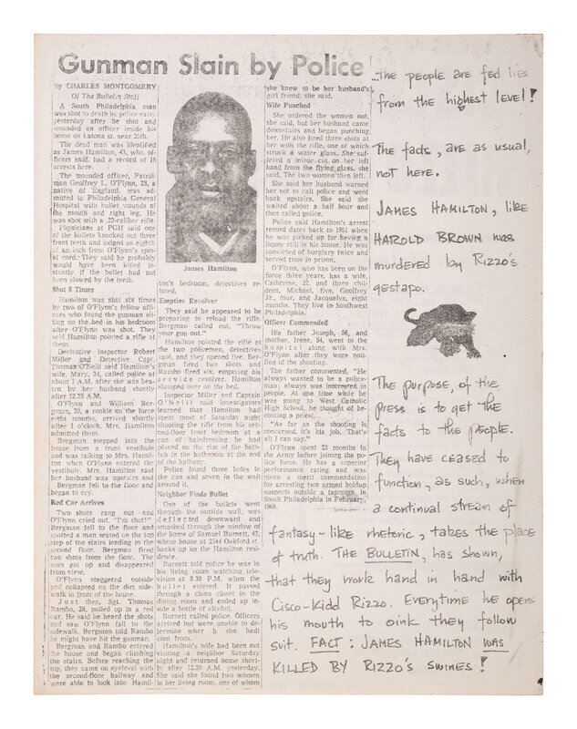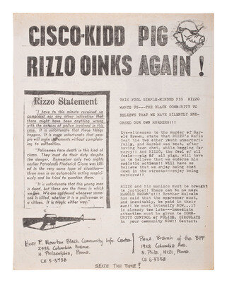 8 1/2 x 11 in. printed flyer (spotting, creasing, soiling). Cisco-Kidd Pig Rizzo Oinks Again! [Philadelphia]: [Black Panther Party], ca 1970. Recto features a statement from Rizzo upholding the actions of Philadelphia policemen in the shooting of a Black man by the name of Harold Brown, along with typewritten assertions that "Rizzo and his maniacs must be brought to justice!!" Verso features photocopied news article about the death of James Hamilton. The Black Panther logo and photocopied handwriting asserting that Hamilton was murdered and the press is untruthful fill in the right margin.