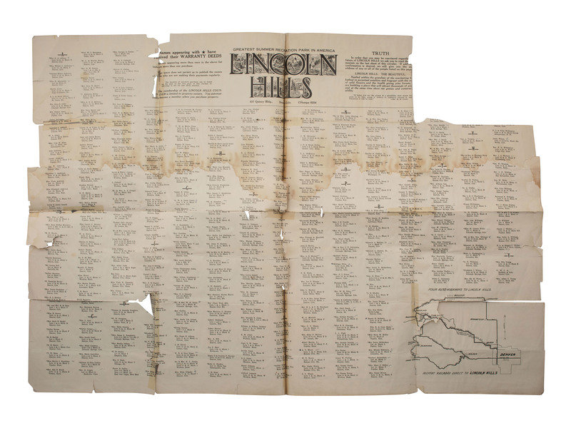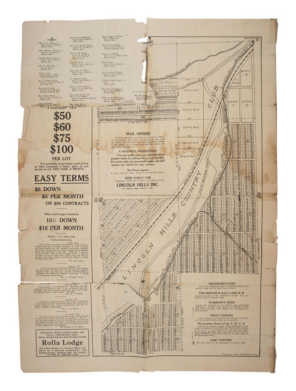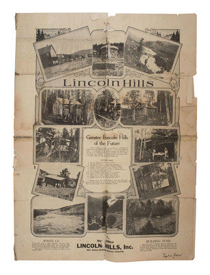 Lincoln Hills marketing brochure. Folio, 16 x 22 in. (heavily tattered, with creases, separations, taped repairs, loss, and chipping throughout). Denver, CO: Lincoln Hills, Inc., n.d. Ink inscribed "Zepha Grant" to lower right. Brochure describes Lincoln Hills as "A city of beauty, a place of refinement, a panorama of achievements and golden opportunities...A challenge to the ability, energy and ingenuity of all soon to be translated into action through our racial unity, civil pride and courage. A contribution to the Great State of Colorado with her fair laws that benefit all." A quotation from the eponymous Abraham Lincoln is featured below a picture index: "Having chosen our course without guile and with pure purpose, let us renew our trust in God and go forward without fear and with manly hearts." Brochure includes images of landscape views and structures on the development, a long list of people who have purchased lots, a map showing railroad and highway access, and a plot map showing the locations of individual lots and estates. Boasts "Easy Terms / $5 Down / $5 Per Month on $50 Contracts."