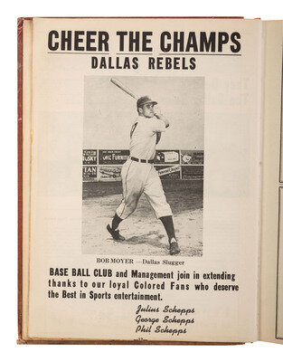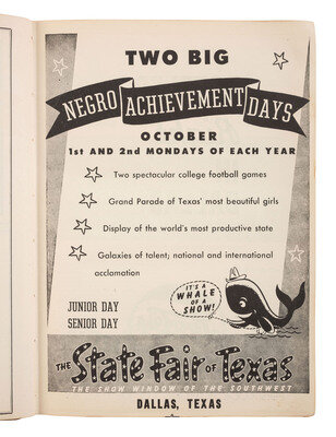 Gilbert compiled and published the directory and was also the editor of Applause magazine. The Directory features an illustrated guide of the city and highlights Dallas’s first black police officers, postal carriers, and others. A section of Dallas attorneys includes William J. Durham (1896-1970), a prominent leader in the civil rights movement who would try Sweatt v. Painter (1950) forcing the integration of the University of Texas School of Law. Illustrated throughout with advertisements of black-owned businesses as well as national brands including Budweiser and Borden's. The State Fair of Texas even advertises “Two Big Negro Achievement Days” and the white Texas League Dallas Rebels baseball team thank their “loyal Colored Fans who deserve the Best in Sports entertainment.”