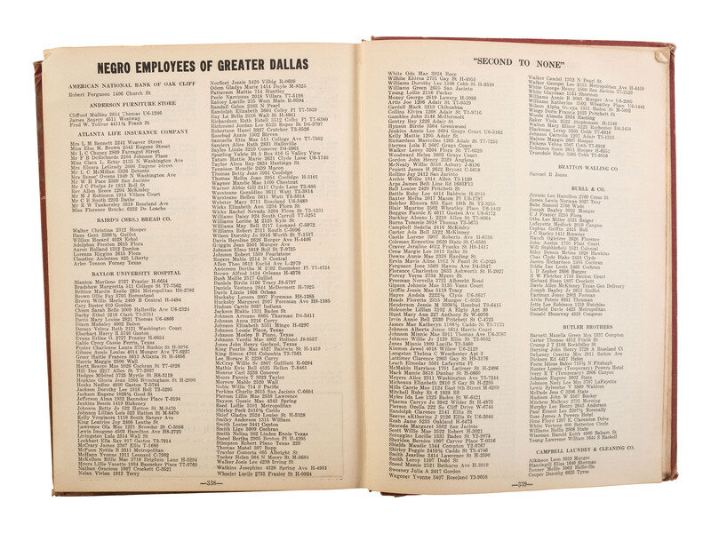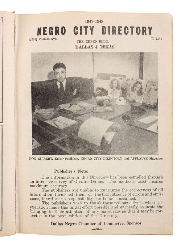 GILBERT, Don, ed. Negro City Directory, 1947-1948. Dallas: Don Gilbert & T.W. Pratt; Dallas Negro Chamber of Commerce, 1947.