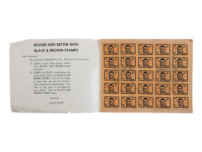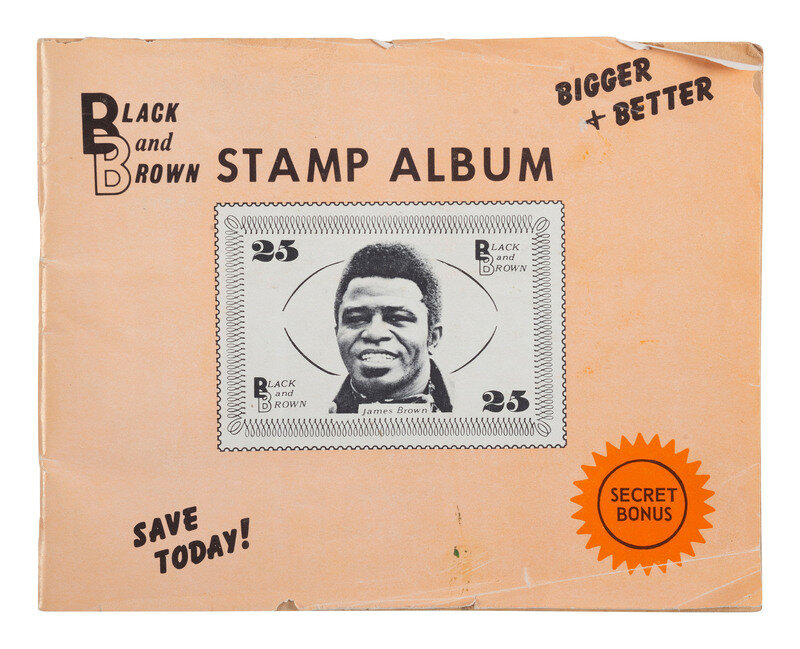 The Black and Brown Trading Stamp Corporation was founded by former pro football wide receiver Arthur "Art" Powell (1937-2015). His goal for establishing the corporation was to increase patronage to black owned businesses in downtown Oakland, California, and promote pride by featuring Black icons. The first and only icon featured on the stamps was James Brown, which reflects his direct support to help start the company. A full book of fifty pages was worth the equivalent of three dollars in merchandise at participating locations.