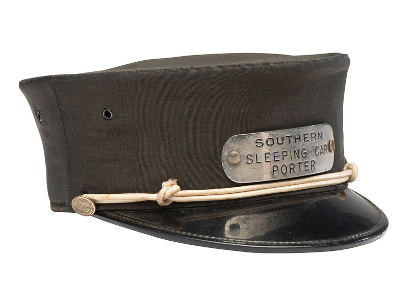 A group of 9 items, including a Pullman porter cap, approx. 8 1/2 x 9 in. and 3 1/2 in. height, faded blue fabric with black visor and cords anchored at each end by a small "Pullman" button, badge at center above visor reads "Southern Sleeping Car Porter," interior sweat band present along with manufacturer's label for "Ruby's Uniform Caps" in Chicago.