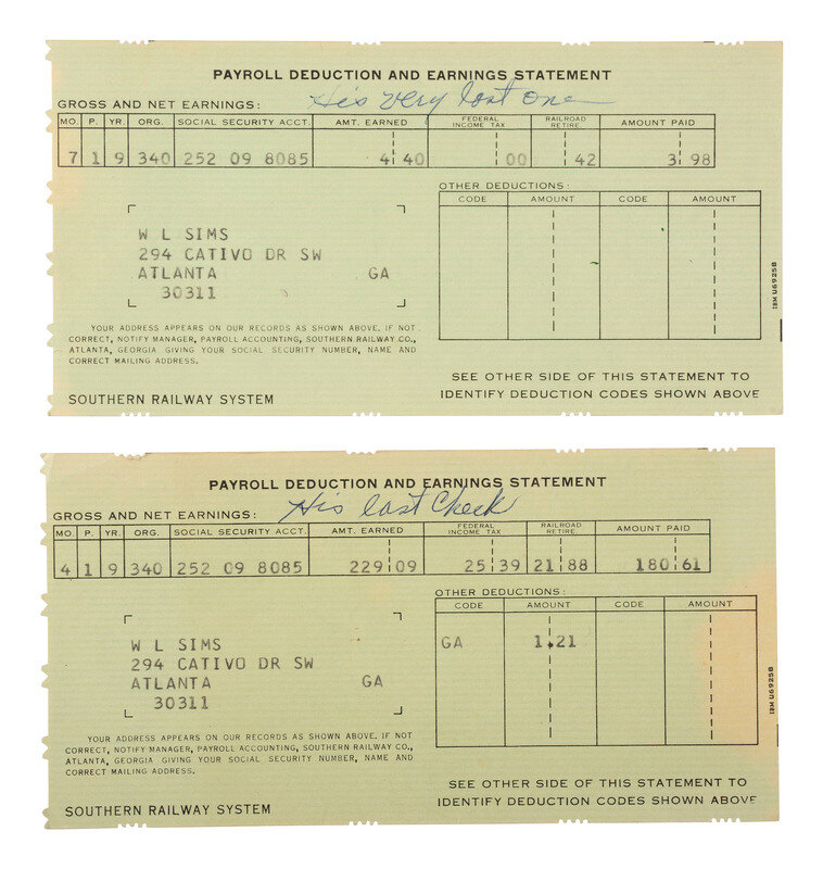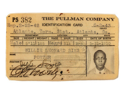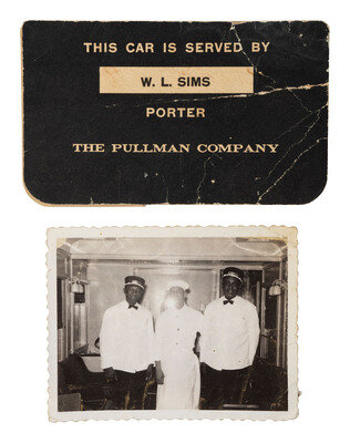 Provenance: From the estate of Nelly Sims, daughter of Willie L. Sims, native of Stockbridge, Georgia. Lot includes a typed personal statement from Sims's daughter describing his work as a Pullman porter.