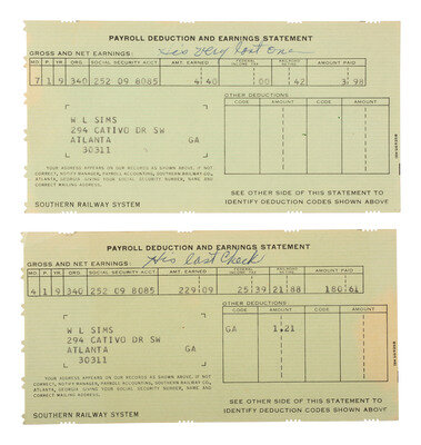 Willie Leonard "W.L." Sims started as Pullman porter at the age of 32, working as a "Southern Sleeping Car Porter" on the Southern Railway System from 1942-1964. Though African American men working as Pullman Porters often faced rampant discrimination, difficult working conditions, and received low pay, the position nonetheless still maintained an aura of prestige within the African American community. This was exemplified, in part, by the Porter's uniform, but came at a steep cost. An April 1915 government inquiry led by Chairman Frank P. Walsh of the Federal Industrial Commission found that porters were typically paid $27.50 a month wages, but were required to purchase their uniforms exclusively at Marshall Fields & Company at the cost of $24.50 whenever they needed a new uniform. Despite this, Sims's daughter's statement indicates that her father was "Proud to be a Pullman porter, [and] Proud to wear the cap that said 'Southern Sleeping Car Porter.'"