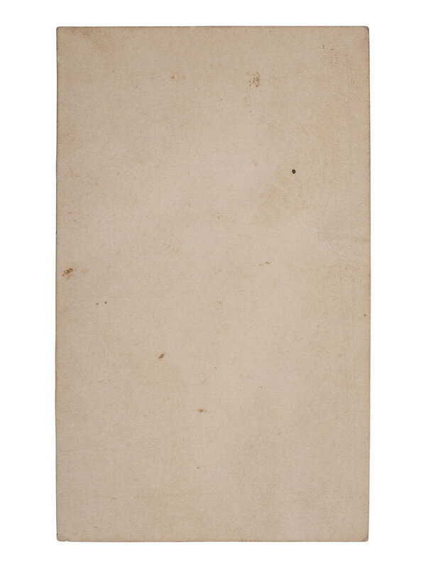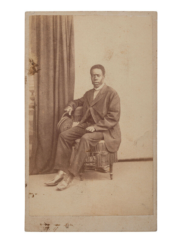 Uncredited, ca 1860s. 2 1/4 x 3 1/2 in. CDV on cardstock mount showing an African American male subject seated in a studio, wearing a suit and holding what appears to be a uniform cap (residue to margins of left and bottom margins of print and mount, small imperfection/crease near right edge of print and mount).