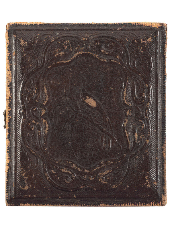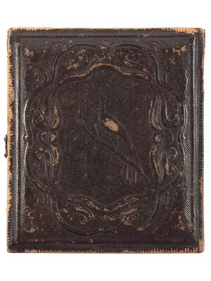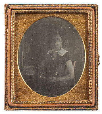 Sixth plate seated portrait of an African American woman wearing gold-highlighted jewelry including dangle earrings. She is shown seated next to a stack of books. (Fading to image, scratching and wiping to plate, some tarnish to plate.) Housed in half leatherette case (general wear).