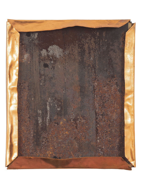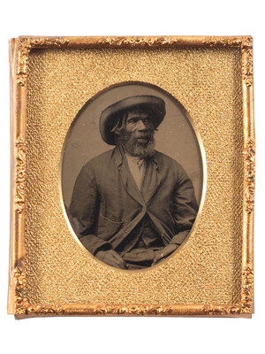 Sixth plate tintype seated portrait of a bearded and grizzled Black man with what appear to be dreadlocks under his thick-brimmed hat. (Heavy loss and oxidation to significant portions of plate mostly covered by mat, other lesser surface scratches and imperfections throughout, subject remains rather clear; unsealed.) Housed under mat, glass, and preserver. Subject wears a worn jacket and gazes slightly upward and to the side, just off-camera.