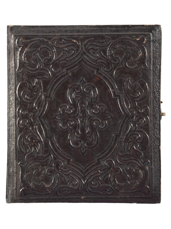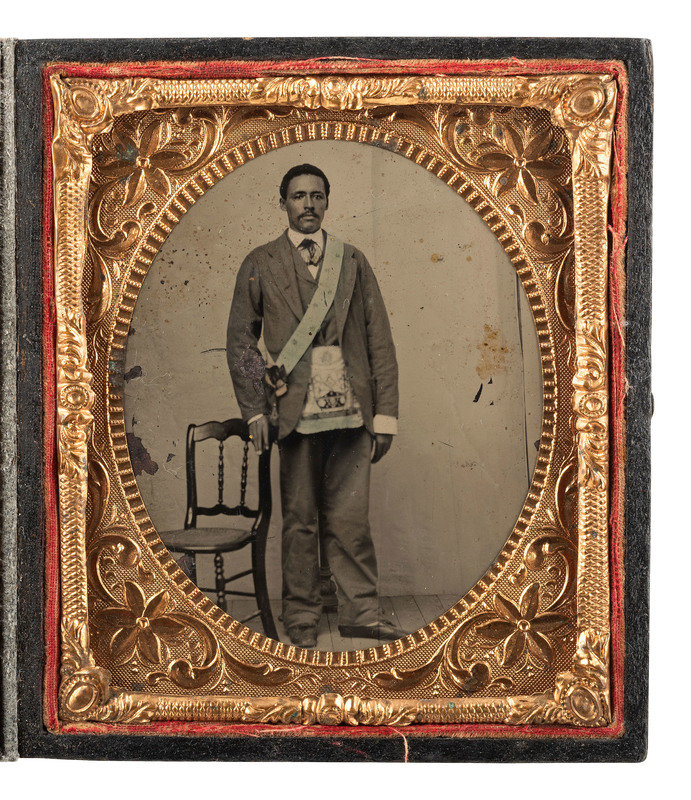 Sixth plate tintype full standing portrait of an African American Freemason. (Some loss to plate, with a few bends/creases, spots, and areas of discoloration/residue; unsealed.) Housed in a pressed paper case. Subject wears a lightly tinted sash and apron over his suit, and stands with his hand resting on the back rail of a chair beside him.