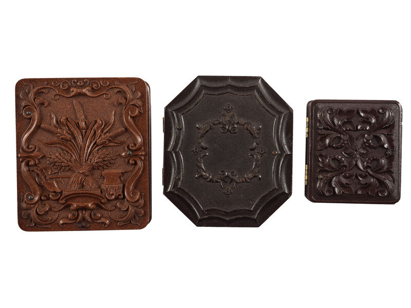 Ninth plate tintype of an African American man standing in a studio wearing a hat and suit (few minor surface scratches). Housed in octagonal Union case with geometric design [Berg 3-40]. -- Ninth plate tintype of an African American woman. Housed in Union case, Harvest Motif [Berg 1-46]. -- 3/4 x 1 in. tintype of a young African American girl (some small scratches/nicks to surface). Housed in Union case with floral/scroll motif (not original to the image). -- Together, 3 tintype portraits of African American subjects. Condition overall good.