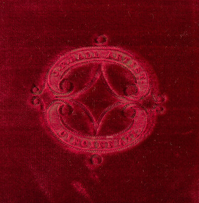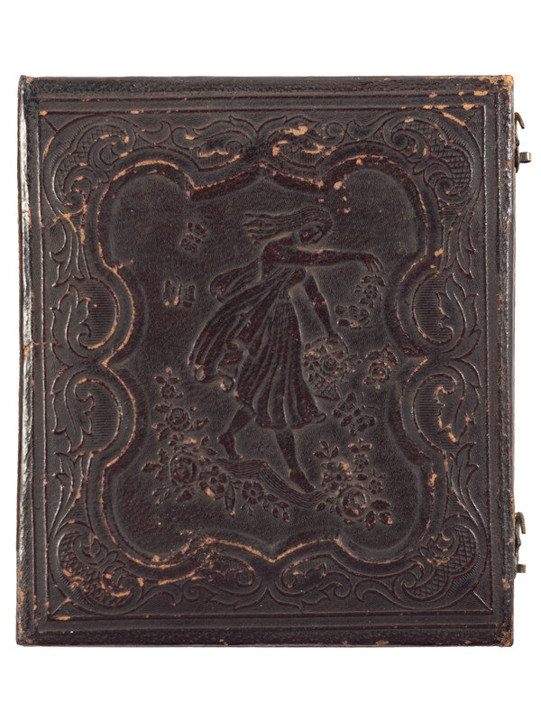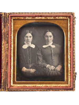 Sixth plate seated portrait of two lovely young women, each wearing a brooch and long chain. (Tarnishing along edge, minor spotting to upper portion; resealed.) Housed in a full pressed paper case with girl scattering flowers motif on both covers (surface wear). Velvet pad marked for Ball. Portions of original seals present in case behind image.