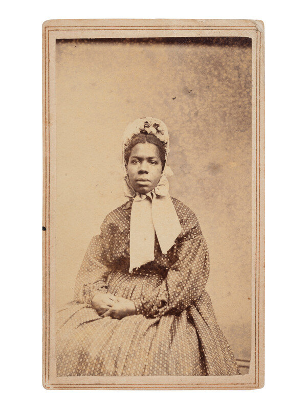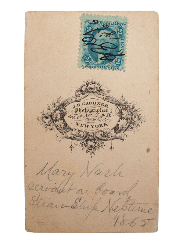2 1/8 x 3 5/8 in. CDV on cardstock mount (toning, some soiling, edge wear to mount). Seated portrait of an African American woman wearing a bonnet and patterned dress, seated against a simple studio backdrop. Penciled notation on verso identifies the subject as, "Mary Nash servant on board Steamship Neptune 1865." Verso with Gardner's studio imprint and 2-cent US Internal Revenue stamp, which appears to be initialed and dated "J.B.G. / 1866."