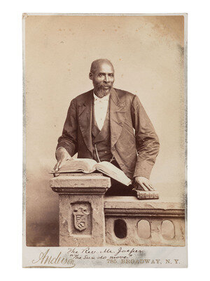 4 x 5 7/8 in. cabinet photograph on cardstock mount (indentation at each corner of mount/print, occasional soiling). Mount recto with photographer's imprint and period identification with quote, "The Rev. Mr. Jasper, 'The Sun do move.'"