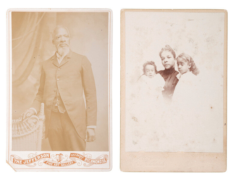 Cabinet card of an African American gentleman. Richmond, VA: Jefferson Fine Art Gallery, operated by James Conway Farley, ca 1895-1906. 3 7/8 x 5 1/2 in. cabinet photograph on cardstock mount (significant toning, few ink marks affecting portrait, wear to mount edges and corners including loss to lower left). Jefferson Gallery imprint on mount recto. Standing portrait of a bearded man wearing a suit and watch chain resting his hand on a wicker chair next to him.