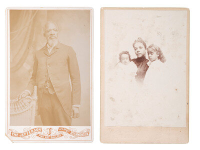 [With:] Cabinet card of a mother and her two young daughters. Toledo, OH: Otis G. Fields, ca 1890. 3 7/8 x 5 1/2 in. cabinet photograph on cardstock mount (toning, soiling throughout, wear with some paper loss to bottom edge; wear to mount edges and corners). Fields' blindstamp to mount recto. Vignetted portrait of a mother with her two young daughters.