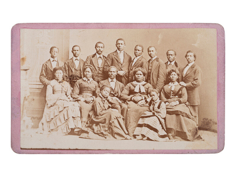 3 3/4 x 2 1/4 in. CDV on cardstock mount (light toning, minimal soiling, some edge wear to mount). A studio view of a group of 15 African American subjects, both male and female, of varying ages. Consignor relates that the CDV was found in a Philadelphia Quaker family album.