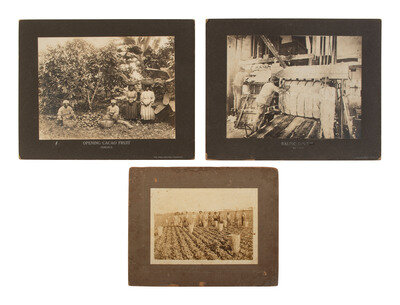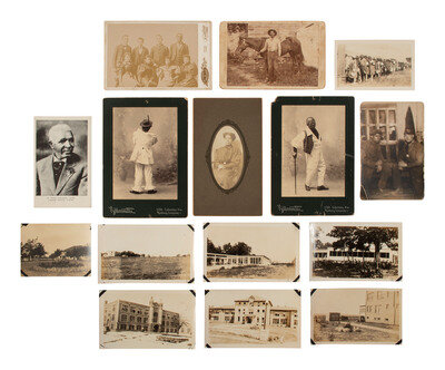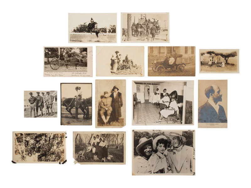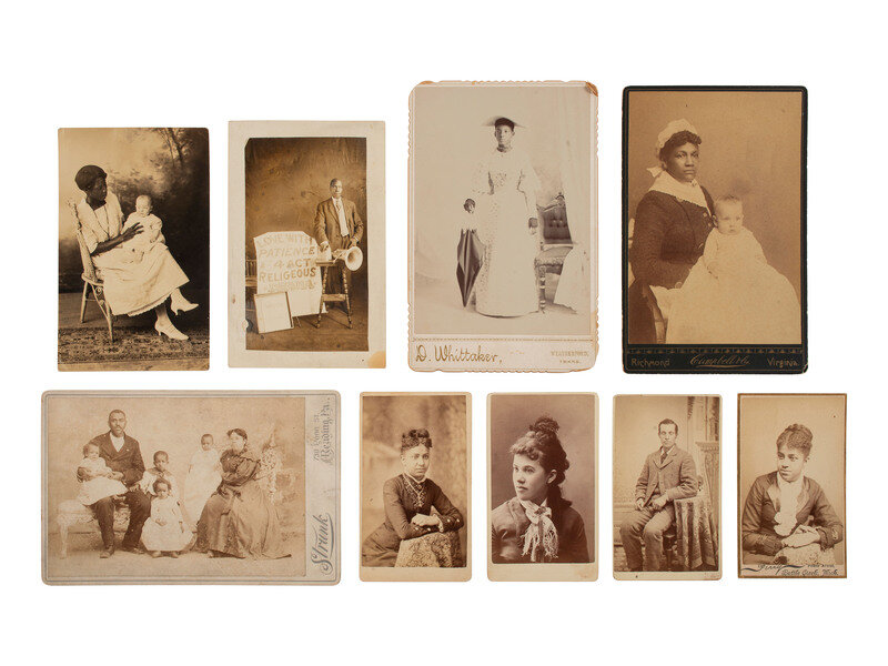 Highlights include a cabinet card featuring a Black woman dressed as a maid holding a white baby on her lap. Richmond, VA: Campbell & Co., n.d. -- 3 CDVs of lovely and well-dressed young Black women, credited to photographers in Battle Creek, MI, Grand Rapids, MI, and Philadelphia. -- CDV of a striking young Black man posed in a studio with a painted backdrop. Barry, IL: E. R. Burnham, n.d. -- Large format mounted photograph of a large group of farm workers out in a field with numerous tall wooden baskets placed every so often among the crop rows. N.p., n.d. -- Cabinet card of a young Black woman wearing an interesting outfit including polka-dotted dress, very thin hat, and beaded choker, and holding an umbrella. Weatherford, TX: D. Whittaker, n.d. -- Cabinet card of a young Black family including a father, mother, and their 4 baby-to-toddler-aged children. Reading, PA: Strunk. -- Real photo postcard featuring an older Black man posed with books, a large brass horn, and a large sign that reads, "Love with Patience - A - 4 Act Religeous [sic] Drama." -- Real photo postcard featuring a profile portrait of W. E. B. DuBois. Boston, MA: West Moreland Co., ca 1900s. -- Real photo postcard of a Black woman holding a white baby on her lap in a studio. N.p., n.d. -- And many more.