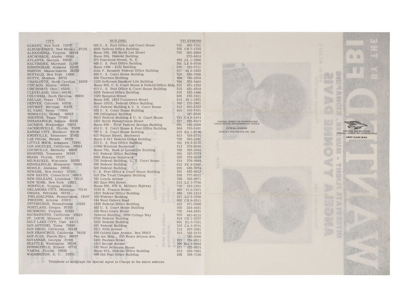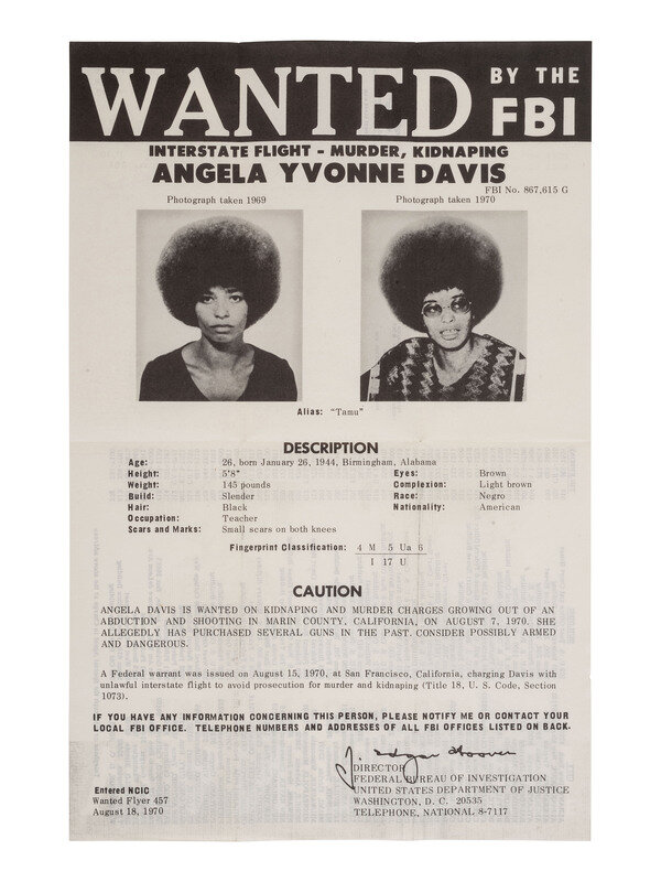 10 1/2 x 16 in. FBI "Wanted" poster (creases at folds). Poster features two images of Davis, descriptions of her physical characteristics, and details on the nature of her alleged offenses. Verso lists addresses and telephone numbers for FBI field offices as well as FBI return address and postage paid imprints.