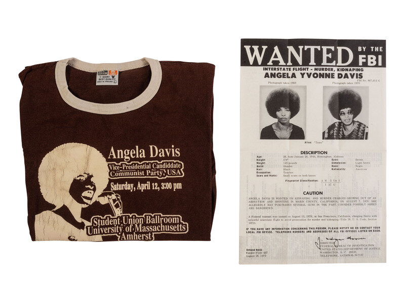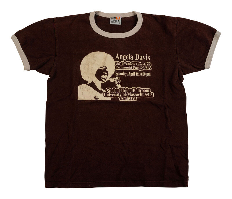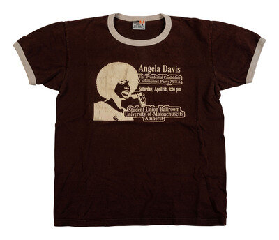 [With:] Vintage brown cotton t-shirt with collar and sleeves trimmed in white, size large, ca 1980-1984, featuring a silhouetted image of Angela Davis and text: "Angela Davis / Vice Presidential Candiddate [sic] / Communist Party, USA / Saturday, April 12, 3:00pm / Student Union Ballroom / University of Massachusetts / Amherst."