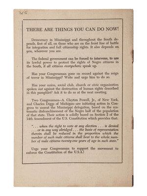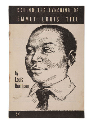 FIRST EDITION pamphlet regarding the abduction, brutal beating, and murder of Emmett Till by Roy Bryant and J.W. Milam. Burnham begins: "In all the foul record of human oppression, few crimes have matched in unbridled savagery the kidnap-murder of Emmett Louis Till. The discovery of the fiendishly mutilated body of this 14-year-ld Chicago boy in Mississippi's Tallahatchie River on August 28, 1955, revealed more than the handiwork of a pair of hate-crazed 'white supremacists.'" He goes on to lay out the denial of human and constitutional rights to all Black people in the southern United States through the plantation economy and the white ruling class, ending with a call to action for "all citizens everywhere" to speak up and urge their Congressmen to enforce the Constitution.
