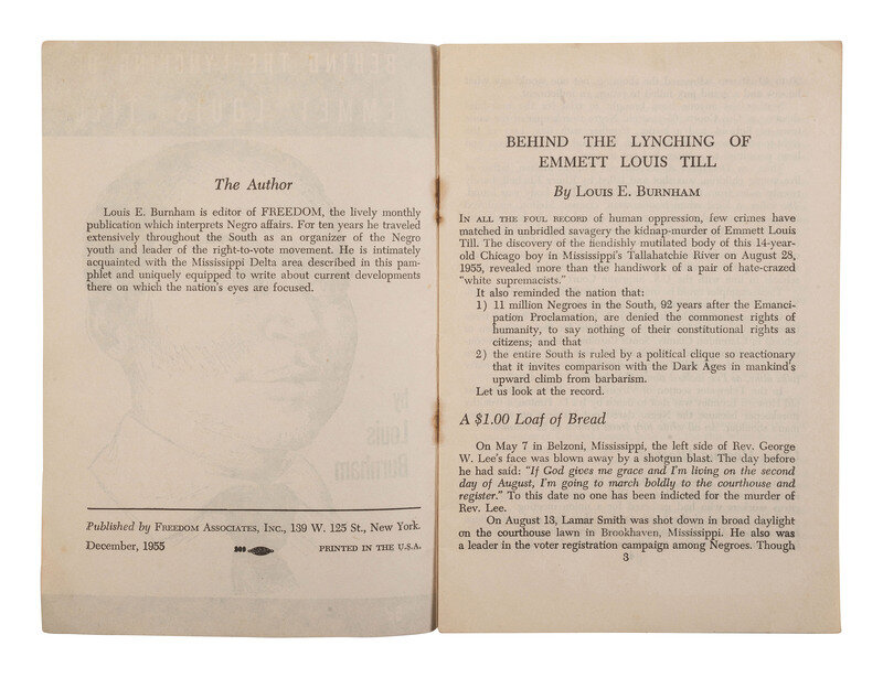 [TILL, EMMETT (1941-1955)]. BURNHAM, Louis E. Behind the Lynching of Emmet Louis Till. New York: Freedom Associates, Inc., 1955.
