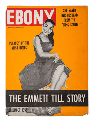 [With:] 10 1/8 x 13 1/2 in. cardstock printed ad (chipping, loss to edges and corners). Promoting the December 1955 issue of Ebony magazine featuring "The Emmett Till Story."