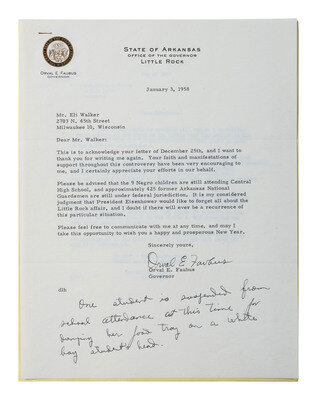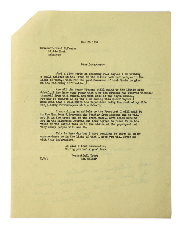 [With:] Typed letter from Mr. Eli Walker to Governor Orval Faubus, attached by staple in left corner to the Governor's reply. N.p., 25 December 1957. 1p, 8 1/2 x 11 in. (creasing at folds).