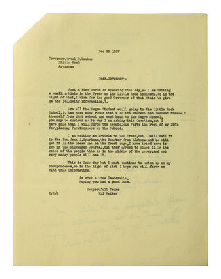 Addressed to Mr. Eli Walker of Milwaukee, Wisconsin. On "State of Arkansas / Office of the Governor / Little Rock" letterhead. 1p, 8 1/2 x 1 1 in. (creasing at folds and corner staple, light wear).