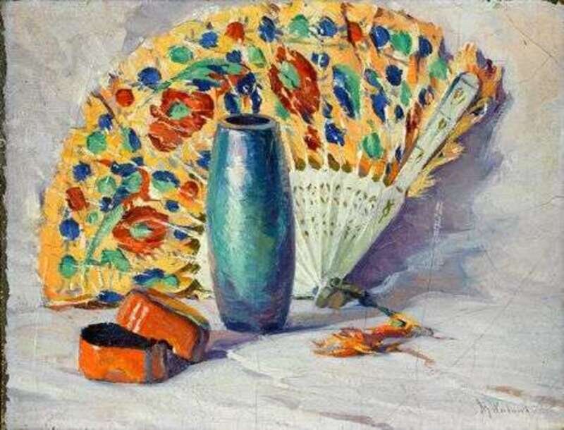 MABEL MAY WOODWARD (AMERICAN 1877-1945) STILL LIFE WITH VASE, FAN AND BOX