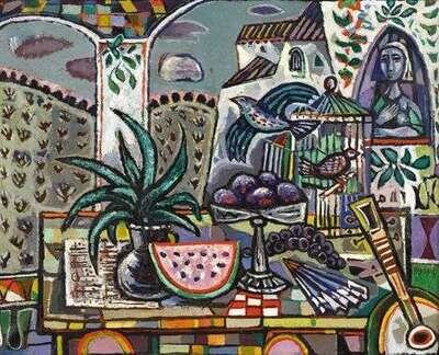 GERARD NEGELSPACH (AMERICAN B. 1927) STILL LIFE WITH FRUIT, MANDOLIN AND SCULPTURE