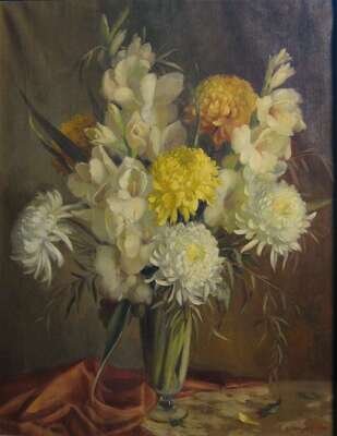 MURIEL P. GERNAND (AMERICAN 20TH CENTURY) STILL LIFE OF GLADIOLAS AND CHRYSANTHEMUMS
