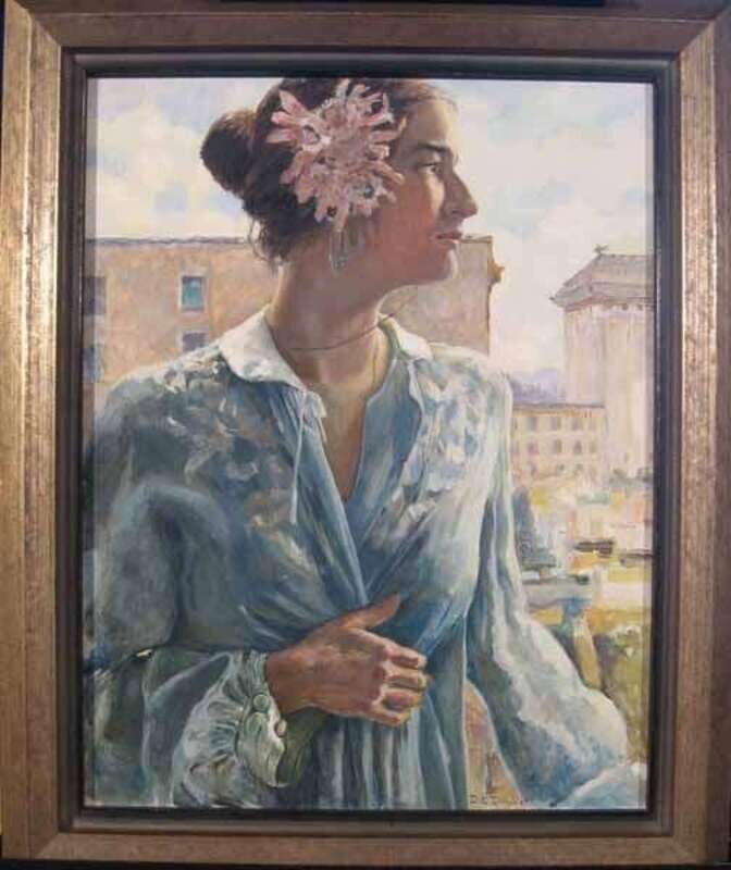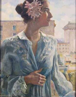 DEBORAH DEICHLER (AMERICAN B. 1948) WOMAN IN BLUE DRESS AND PINK FLOWER