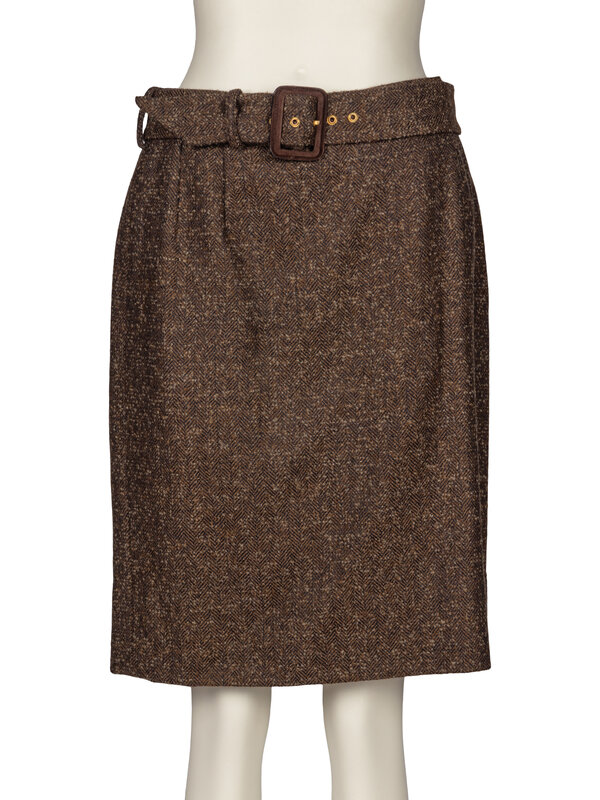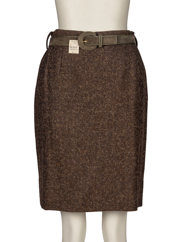 Knee-length skirt in brown wool-blend tweed. Button and zip closure at back. Includes matching belt.