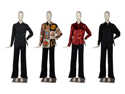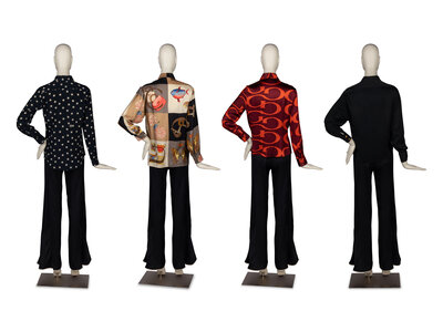Button-down blouse printed with graphics including Gucci Horsebit loafers, Bamboo 1947 handbags, riding boots, butterflies, fruit, teacups, fish, and flowers. Shoulder pads.