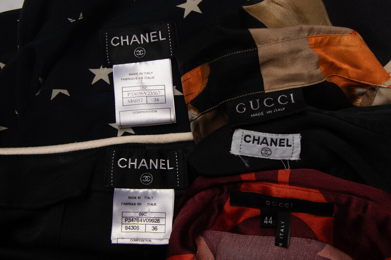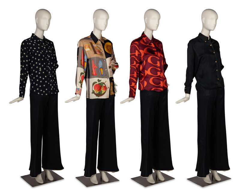 Group of Four Silk Tops by Chanel and Gucci, One Pair of Chanel Silk Pants