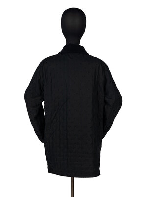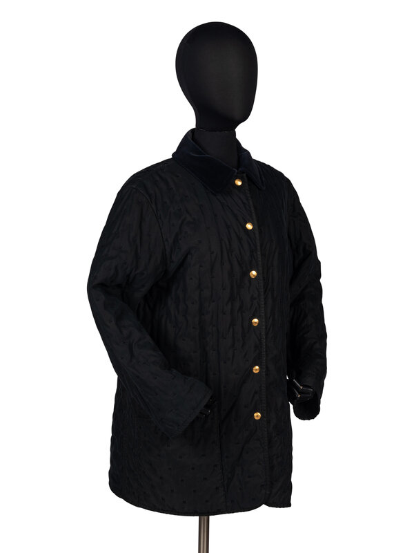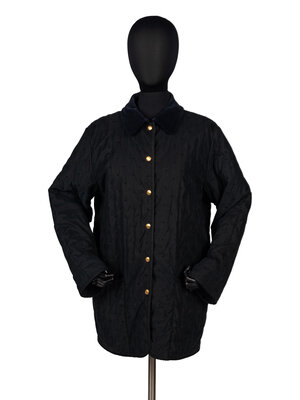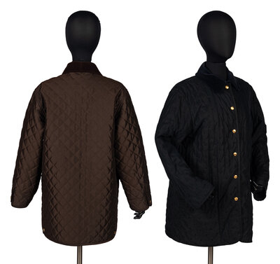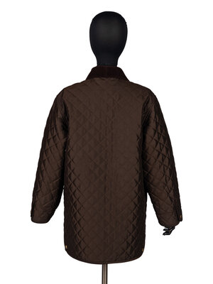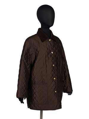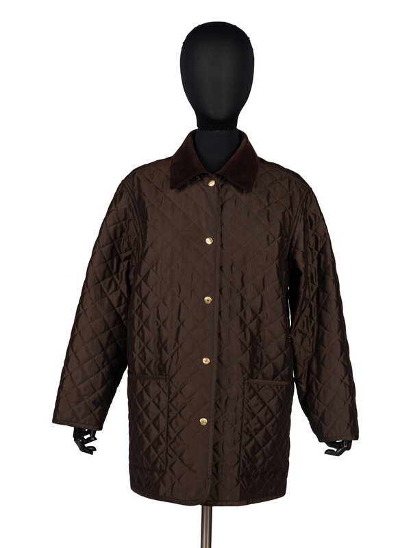 Snap-front jacket in quilted, brown poly blend with corduroy collar. Two patch pockets at front with a slight quilting effect.