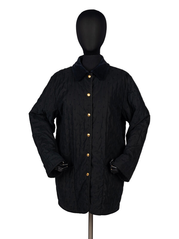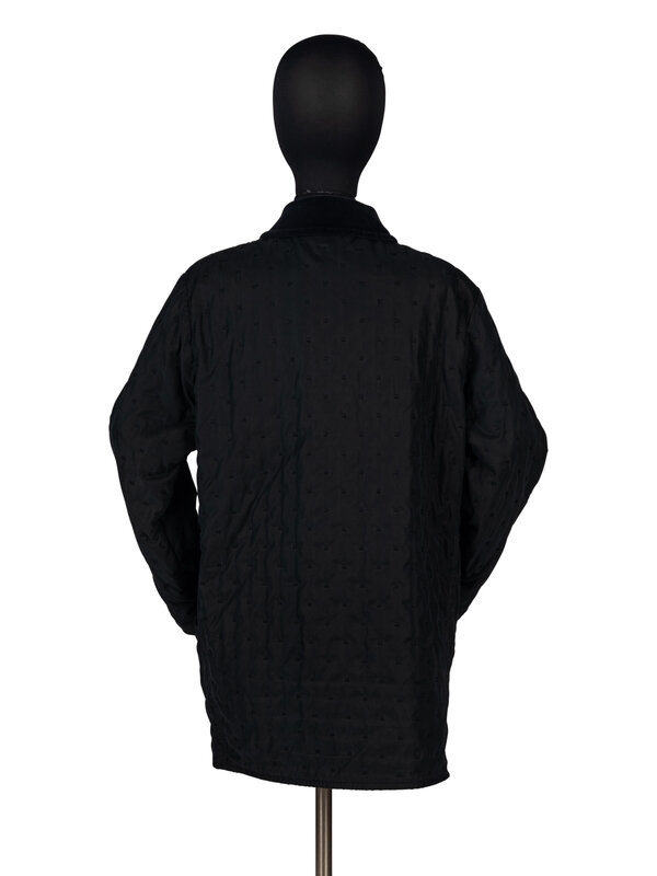 Single-breasted, snap-front jacket in embroidered, navy blue poly blend with velvet collar. Lightly padded with slightly dropped shoulders. Two patch pockets at front.