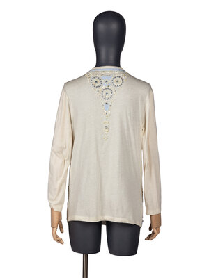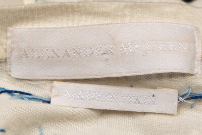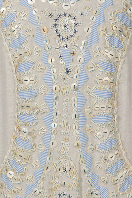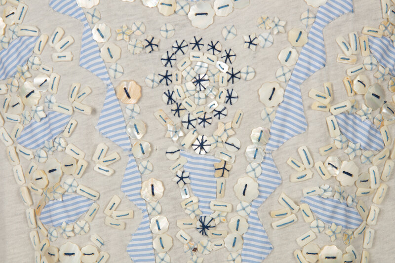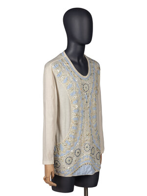 Longsleeve tunic in ivory cotton knit jersey with hand-embroidered carved shell and blue-white stripe overlay accents. Part of Alexander McQueen's "Lord of the Flies" collection for Spring 2006.