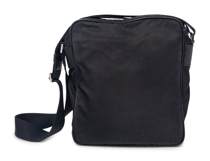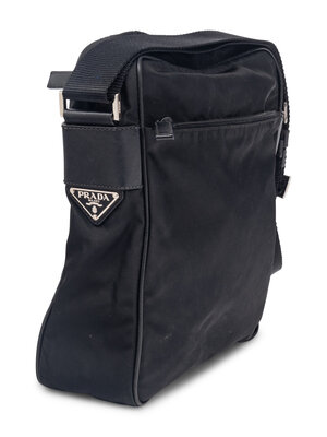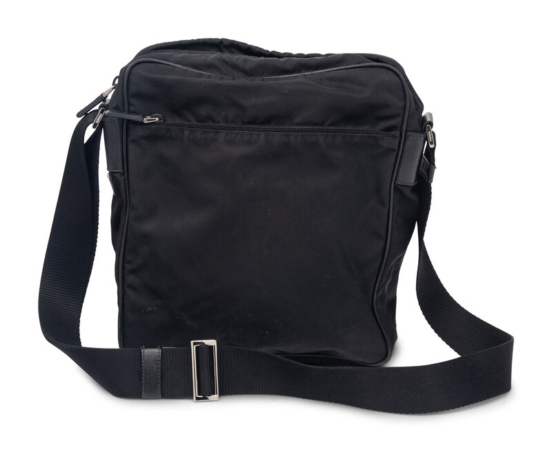 Prada medium zip shoulder bag in black nylon gabardine with Saffiano leather trim and silver-tone hardware.