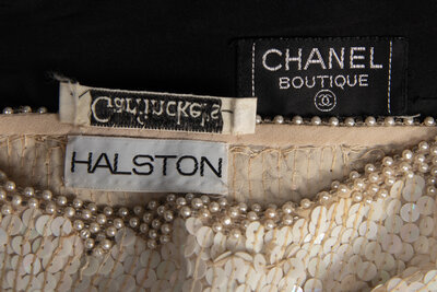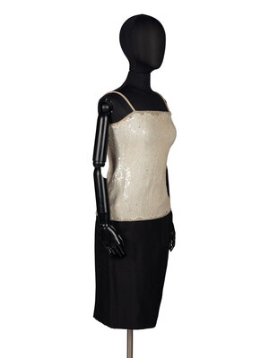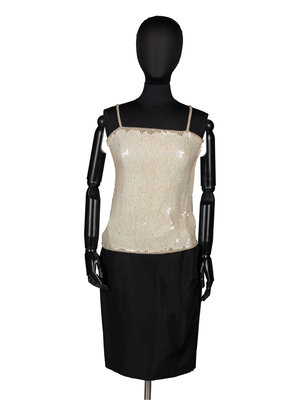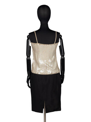 Sleeveless top in paillette-embellished chiffon with faux pearl trim at shoulder straps, neckline, and bottom hem.
