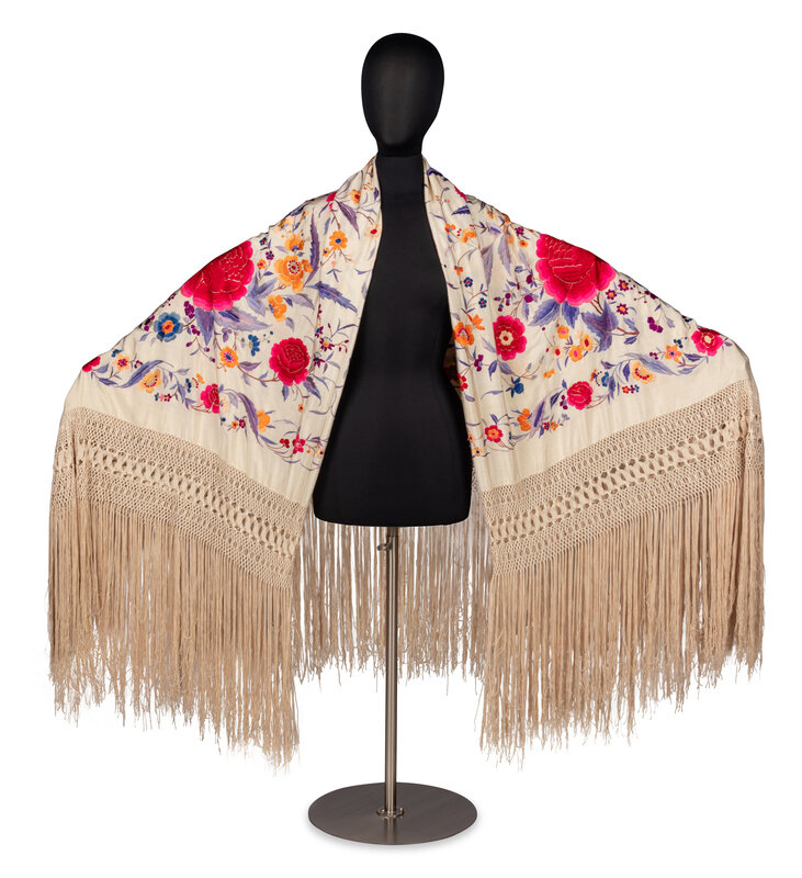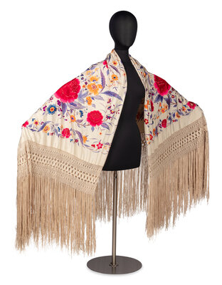 Silk piano shawl in floral-embroidery throughout with knitted fringe trim at edges.