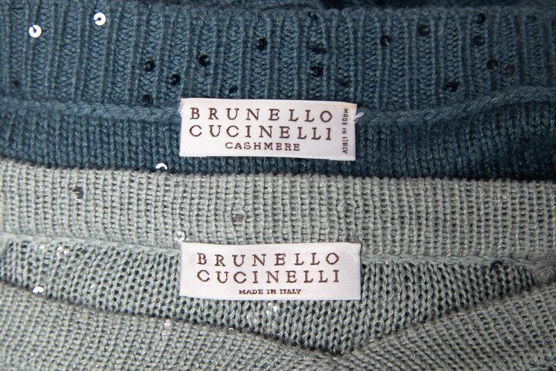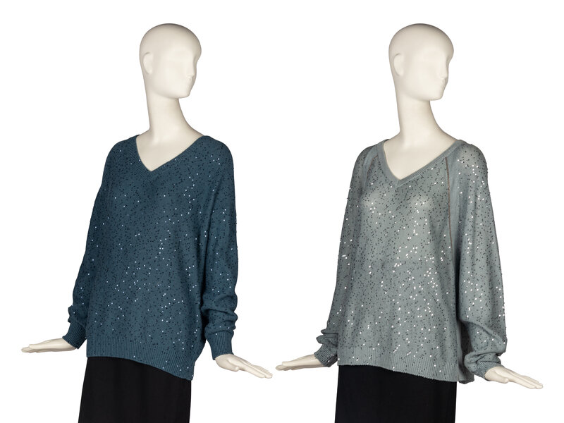 V-neck "Dazzling" sweater in light blue linen-silk blend with monili trim.