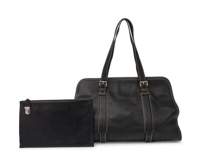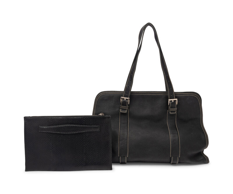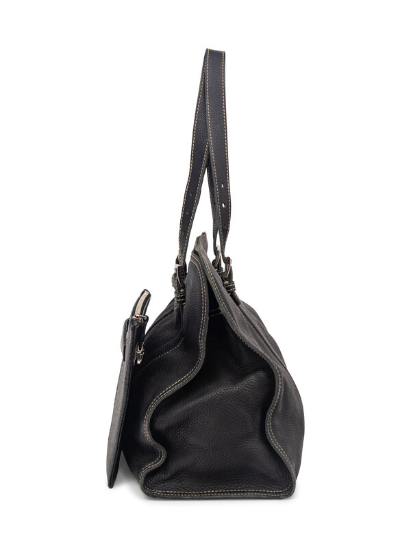 Medium shoulder tote in black pebbled leather with contrast stitching and silver-tone hardware.